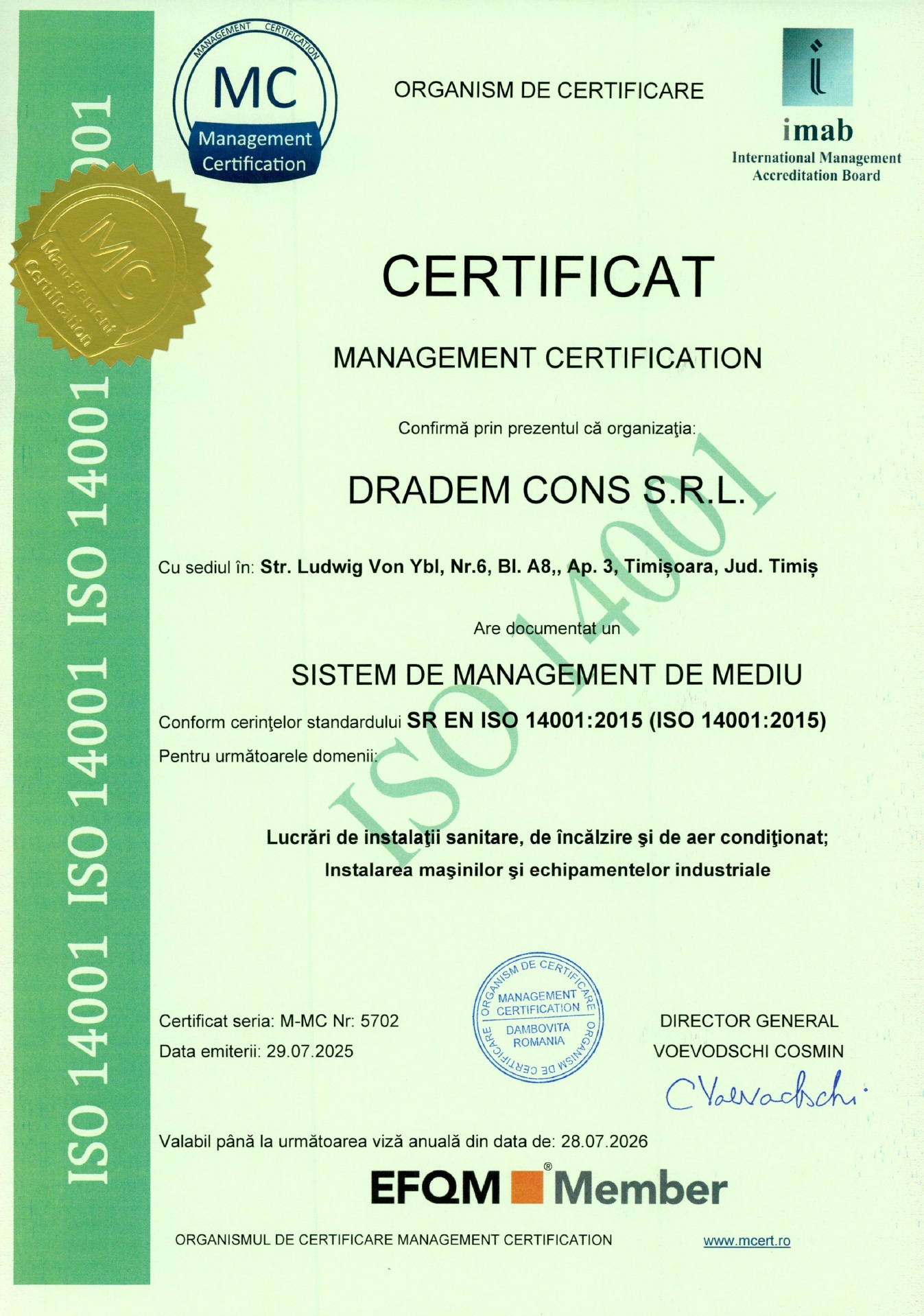 🌱 ISO 14001 atestă că Dradem Cons implementează un sistem eficient de management de mediu, reducând impactul asupra mediului și promovând practici sustenabile în toate procesele noastre operaționale.